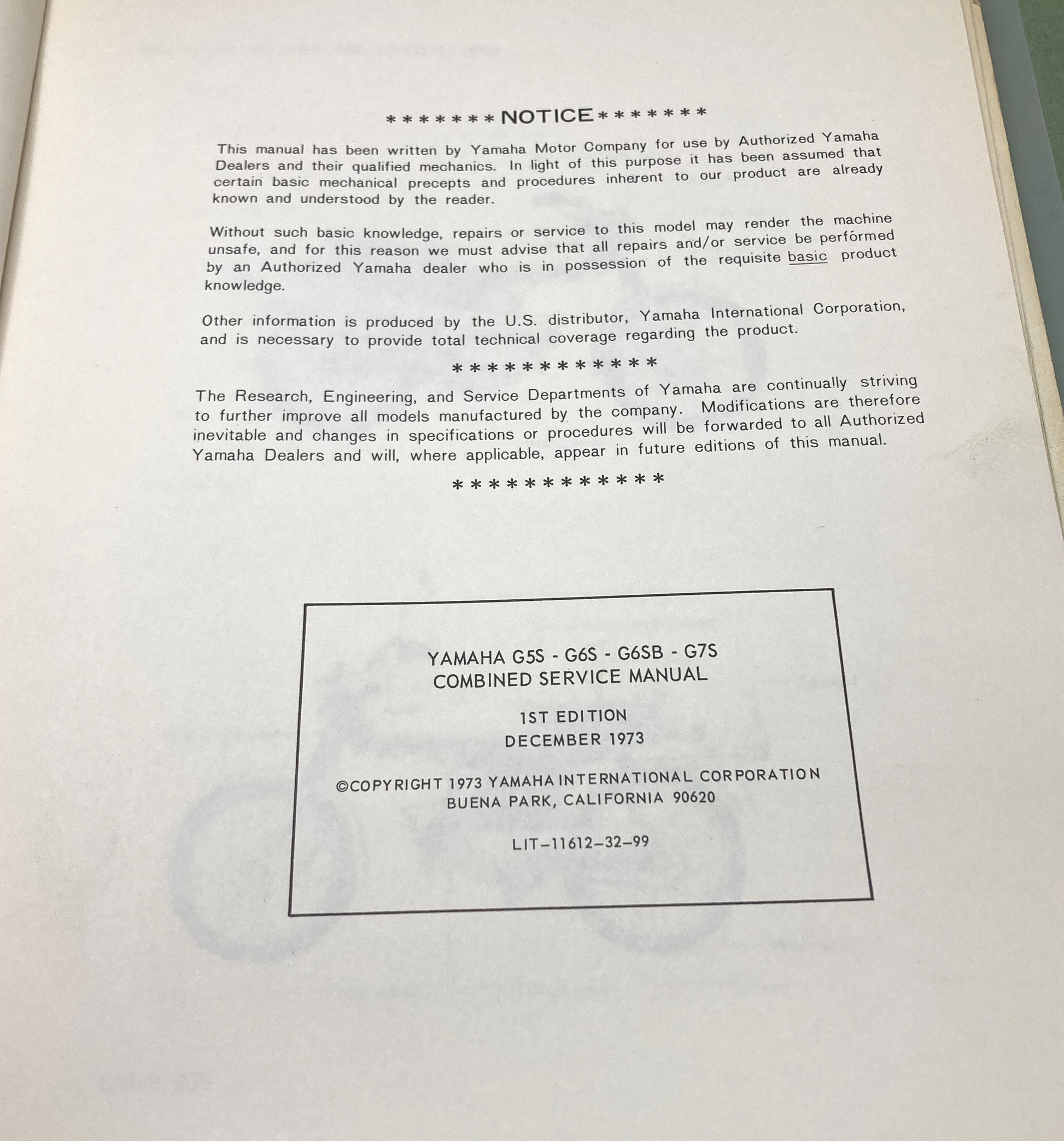 Genuine Yamaha LIT-11612-32-99 G5S G6S-G6SB G7S Service Manual 1973