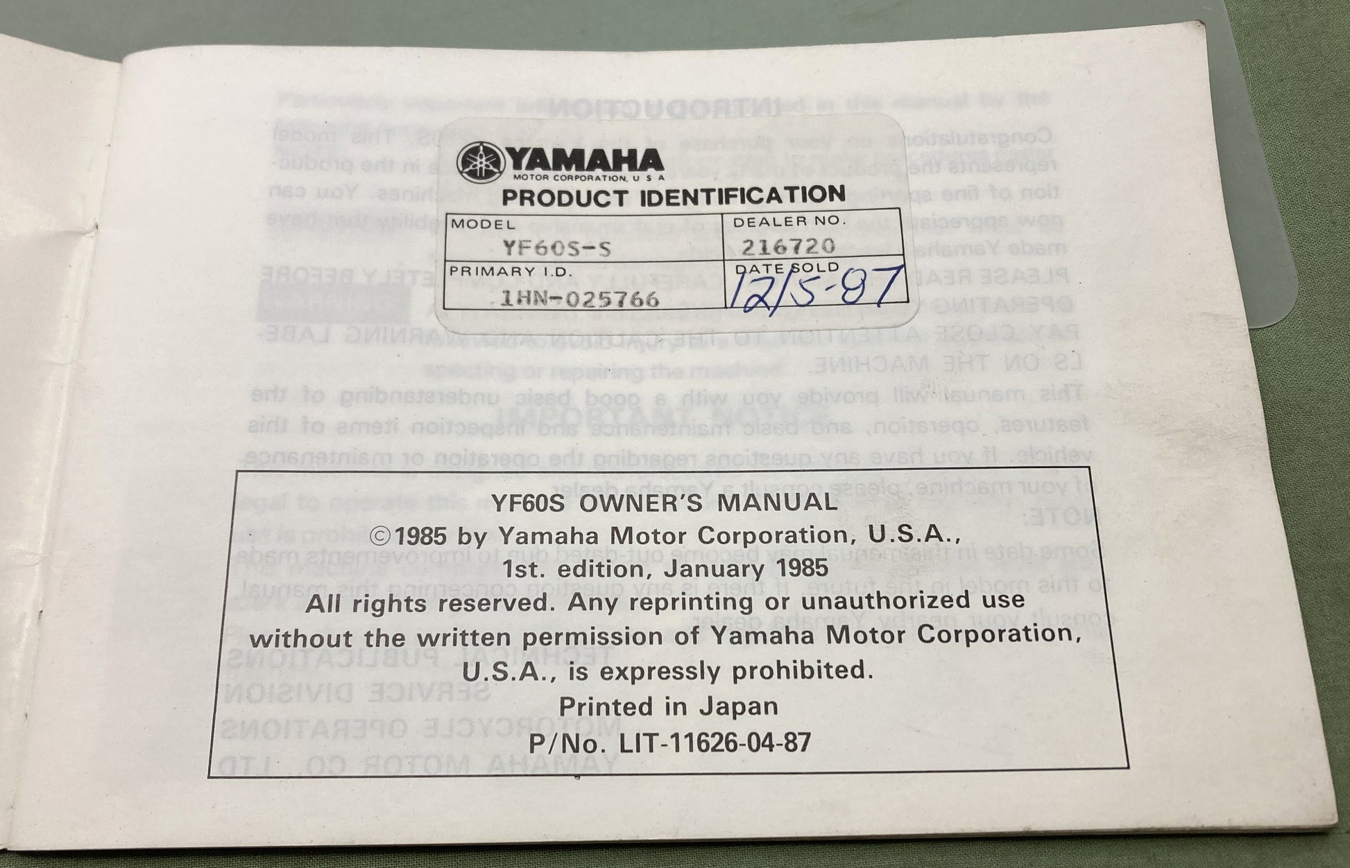 Genuine Yamaha LIT-11626-04-87 YF60S Owner's Manual 1985