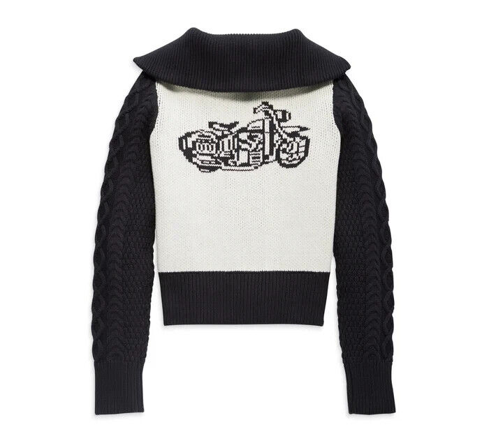 Treat yourself or surprise your special Harley fan with this winter wardrobe addition. Crafted for breathable warmth from all-cotton yarn, our Artisan Zip Front Motorcycle Sweater features an attractive shawl collar and durable rib-knit trim. The cable-knit sleeve accents add stylish dimension, but what makes this a true statement piece is its bold intarsia knit design on the front and back.