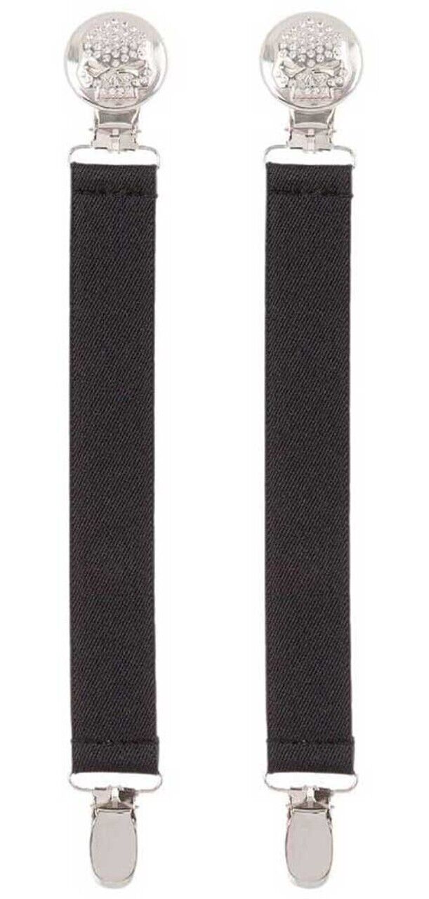 Constructed from durable metal and strong stretchy elastic. Polished nickel finish. Beautifully rhinestone encrusted Willie G Skull logos. Sold as pair. Steer clear of the crawling pant leg. This bling Boot Straps keep your pants in place while on your ride. Elastic suspender-style boot straps with clips. HDWBS11520.