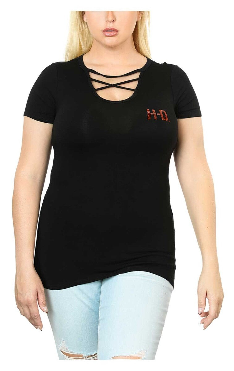 Harley-Davidson® Women's Winner's Circle Short Sleeve Tee - Black, HT4640BLK. Awesome checkered Bar & Shield logo graphic encrusted with multi-colored rhinestones on back. Mini rhinestone embellished H-D® graphic on front chest. Attractive scoop neck with criss-cross detailing. Extremely comfortable and stretchy lightweight material. Made from 95% rayon and 5% spandex. For a casual look, pairs perfectly with denim. Made in the USA.