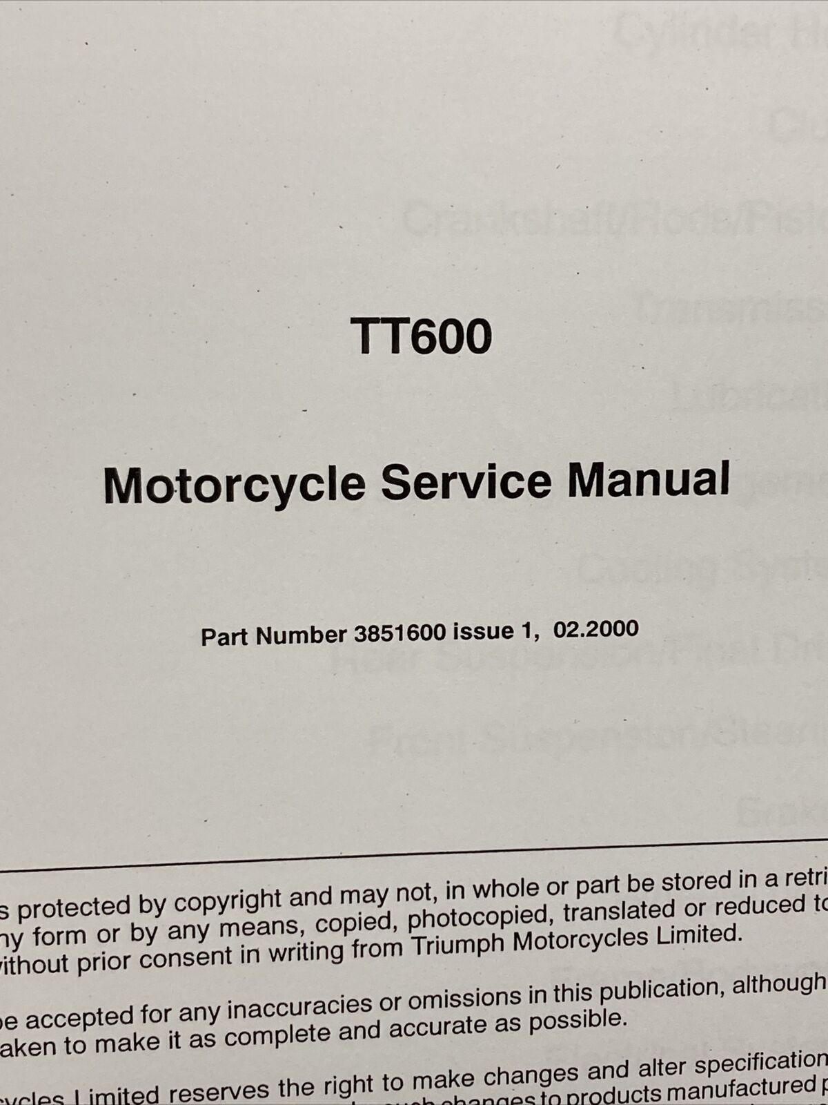 NEW VICTORY 3851600 TRIUMPH TT600 SERVICE MANUAL ISSUE 1, 02.2000
